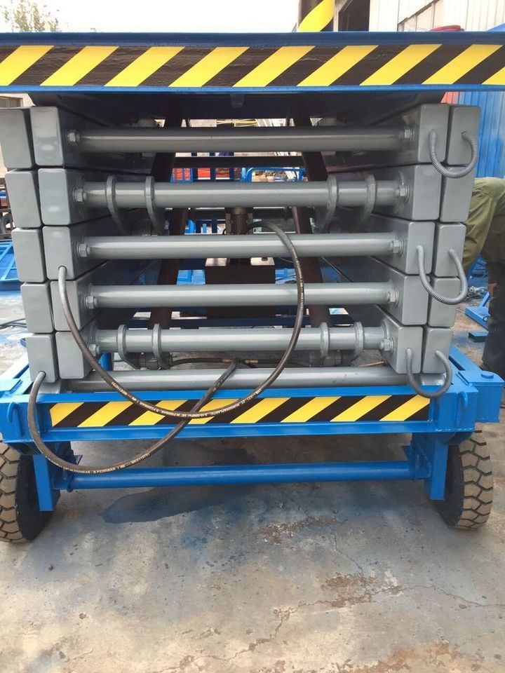 載重1噸臺面尺寸2100長*1500寬 升高10米這一臺是發往重慶的客戶定5臺設備 材料是根據宇軒升降機設計師 高菲來設計的他是在整個華北地區升降平臺行業設計能力最強一名優秀設計師 他給的材料 輪胎使用實心輪胎 剪叉枝干 200*100矩形管 家100圓鋼作為角度軸 臺面鋪設6mm后的花紋板等。
