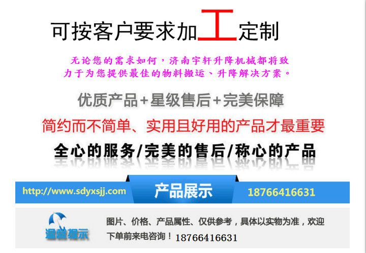 升降機www.sdyxsjj.com是一種用于起升貨物的液壓升降設備,采用液壓油缸作為動力傳輸的重要鏈條和鋼絲繩,確保機器運行的絕對安全。無坑和機房,特別適用于地下室,倉庫改造,新型貨架等,安裝維修方便,美觀,安全,操作方便。根據實際現場環境具體生產。