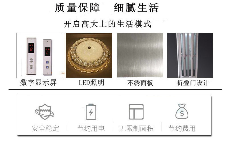 家用別墅電梯: 載重:200kg-500 kg 材質:304#鏡面/發紋不銹鋼--鋼化玻璃--鈦鎂合金--鈦金蝕刻 控制方式:數顯控制 售后:質保一年、終...