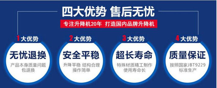 2、提升高度高,采用旁置油缸,或雙側式油缸,運行平穩,無噪音,維修方便,使用壽命長。