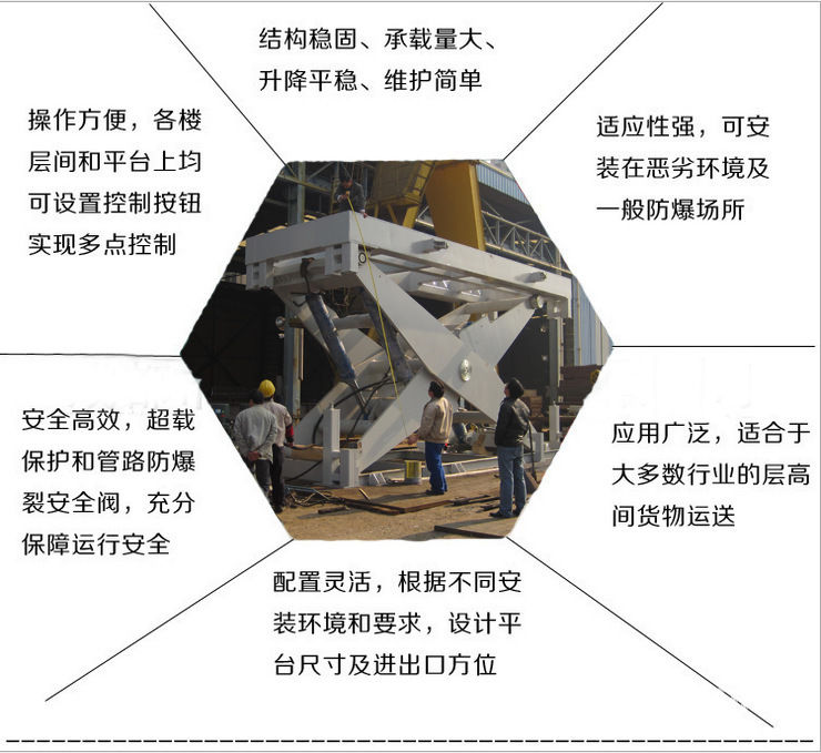 和升降臺工作臺面均可設置操作按鈕,實現多點控制。產品結構堅固,承載量大,升降平穩,安裝維護簡單方便,是經濟實用的低樓層間替代電梯的理想貨物輸送設備。